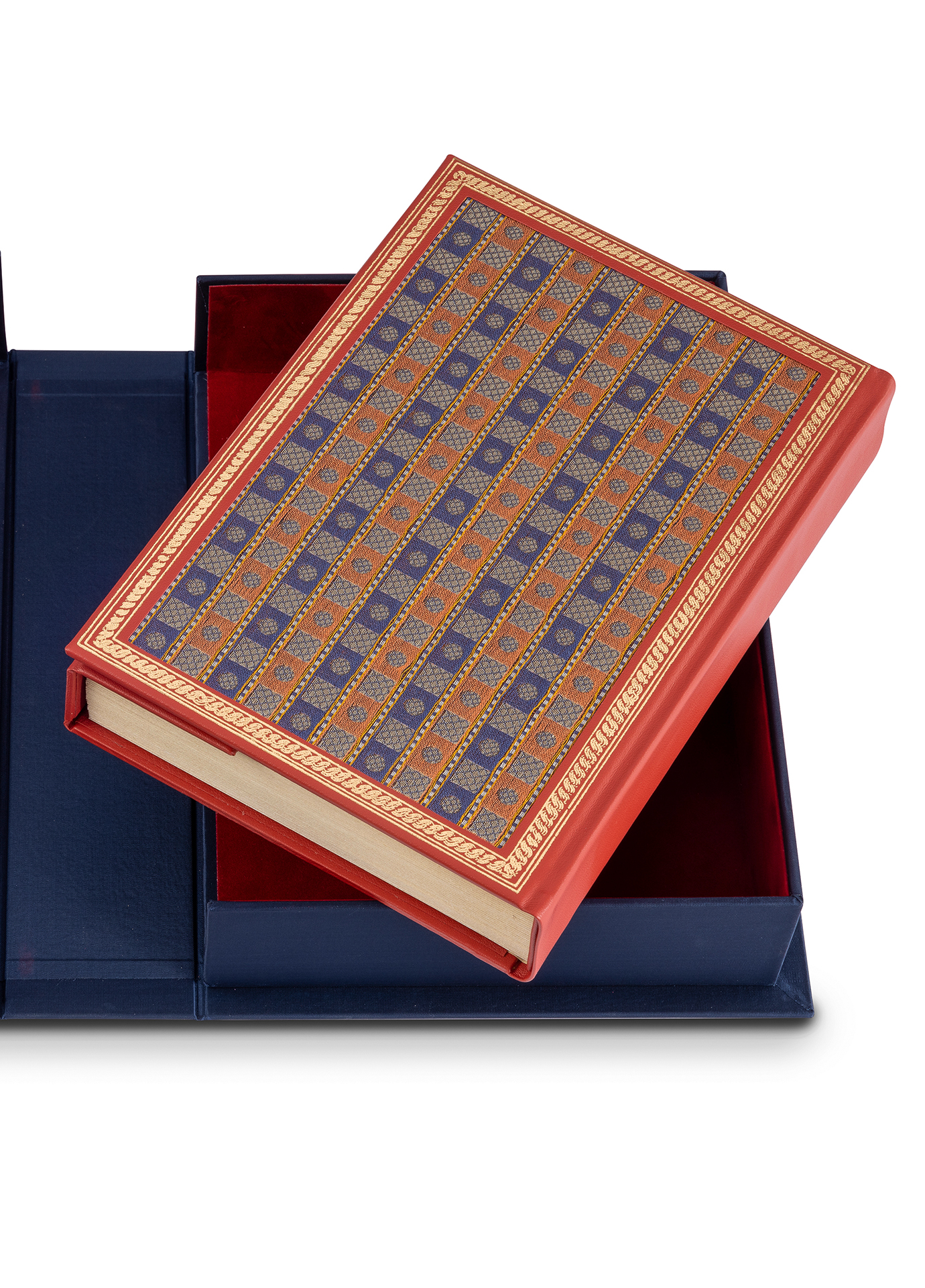 | Binding | Elegant leather binding with gold-embroidered fabric inlays, interior covers in gold-tooled leather with a flap. Luxury case |