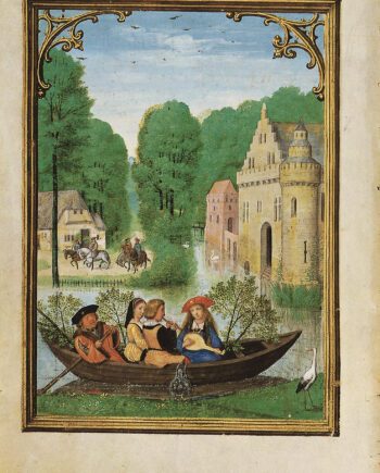 Die ganzseitige Illustration des Monats Mai ist ein hervorragendes Beispiel für die Vielfalt und die künstlerische Qualität der Kalenderbilder in diesem Buch. Im 15. Jahrhundert entwickelten sich zwei zentrale Themen für die Darstellung des Monats Mai in den Kalenderseiten von Stundenbüchern: der aristokratische Ausritt zu Pferd und der festliche Ausflug in einem mit Girlanden geschmückten Boot. Beide Motive sind in diesem Kalenderbild kunstvoll miteinander vereint.