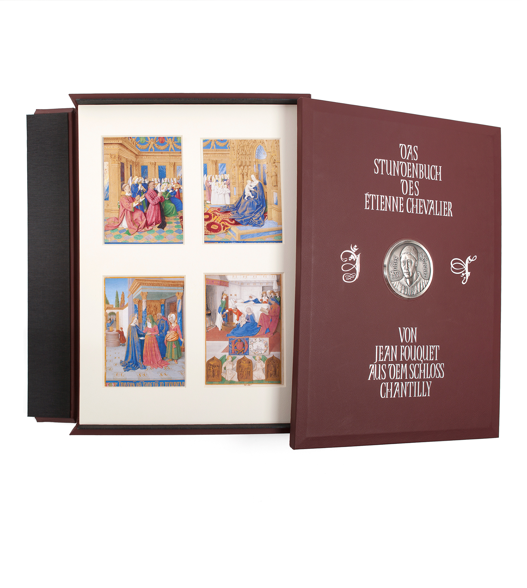 | Bucheinband | Schmuckkassette aus echtem Leder mit der Replik einer Münze mit dem Bildnis Jean Fouquets auf dem Vorderdeckel |